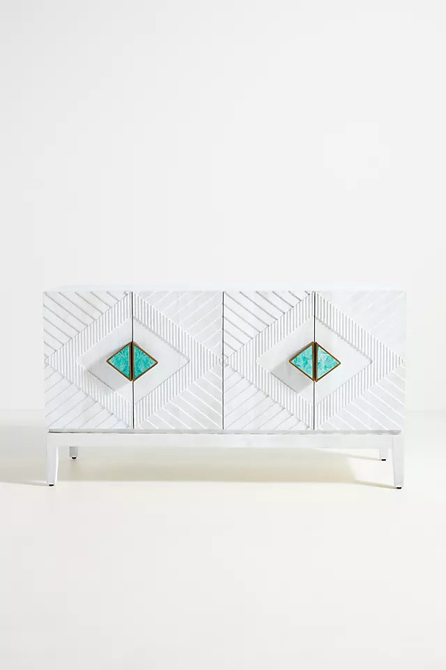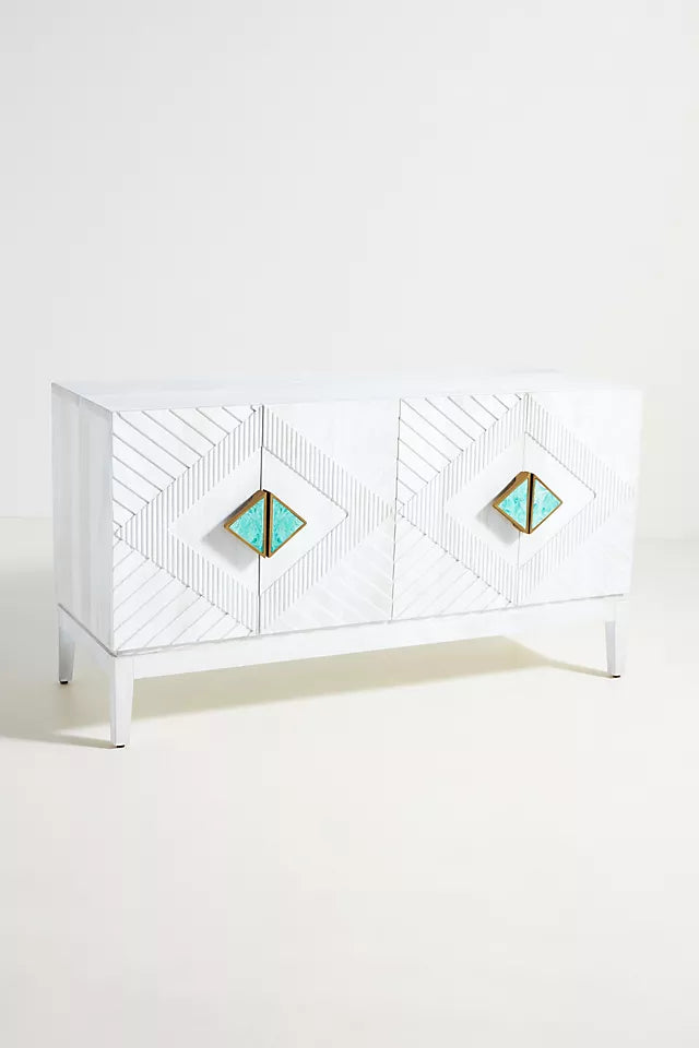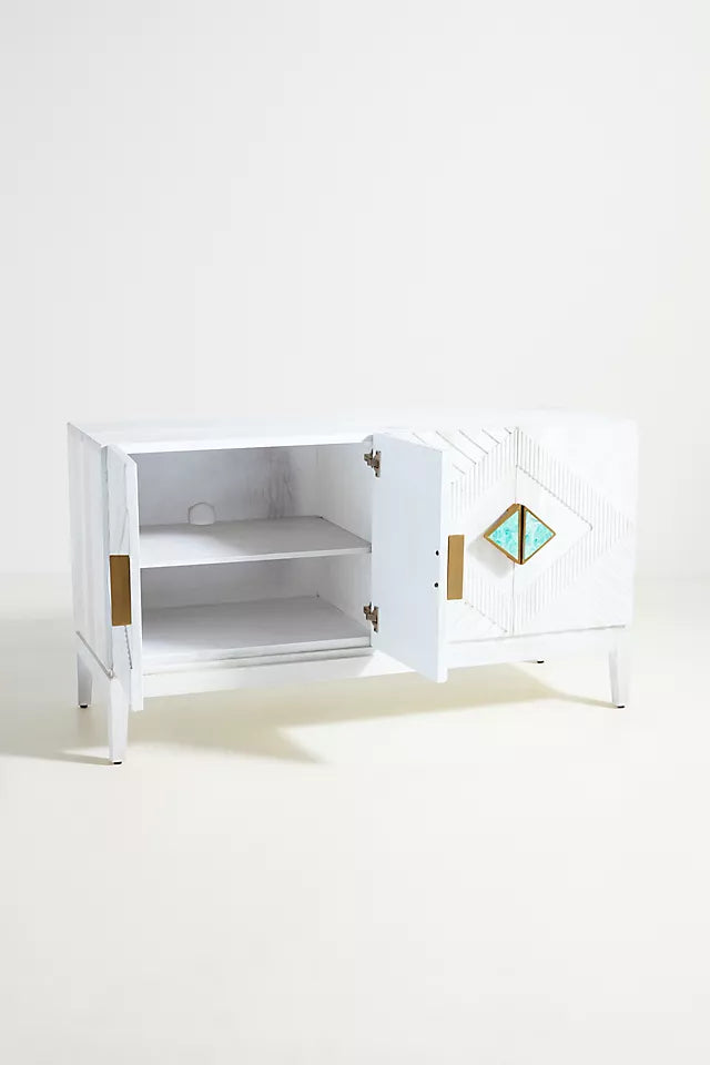 This beautiful buffet offers ample storage space and is ideal for decorating any room in your home. Its design features geometric shapes, handcrafted carving and painting, embellished with agate stone.