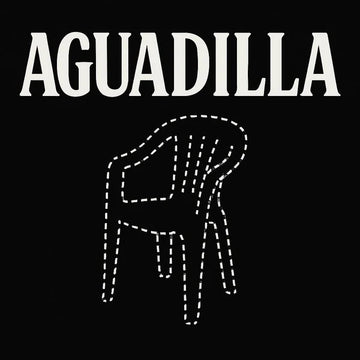 The T-shirt features the text 'AGUADILLA' in bold uppercase letters above a graphic of a chair outlined with dashed lines. The text is in SPANISH and refers to Aguadilla, a municipality in Puerto Rico. The chair graphic, styled in a minimalist and dotted line art, may symbolize simplicity or leisure associated with Aguadilla. The design is in white on a black background.
