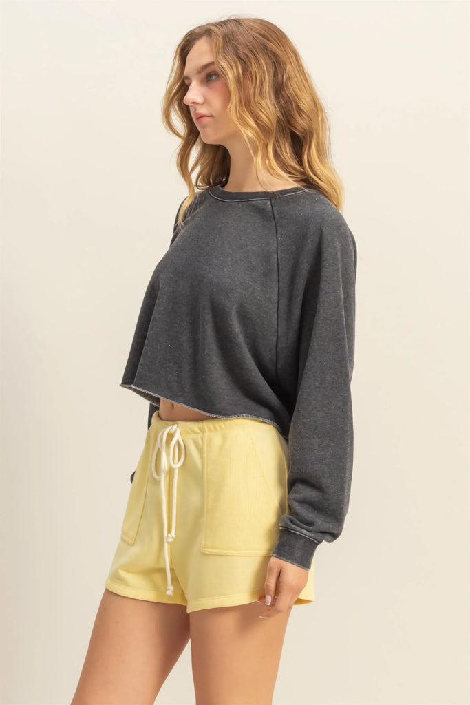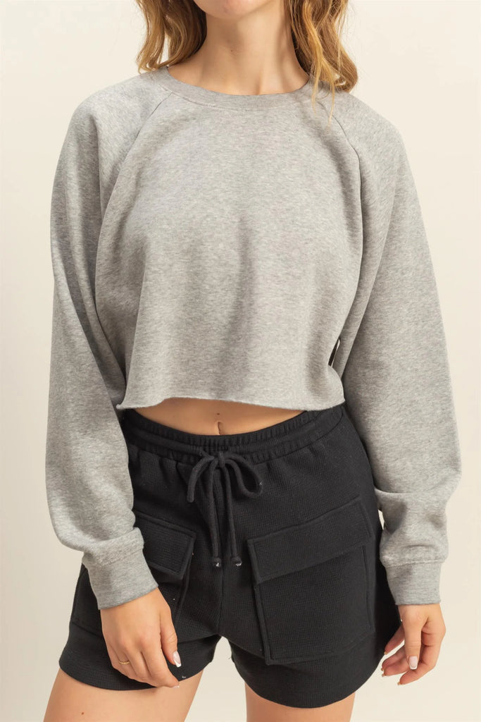Make Casual Wear Stand Out In A Lightweight And Breathable Crop Sweatshirt That Has A Crew Neckline, Dropped Shoulders, A Boxy Bodice, Long Sleeves With Fitted Cuffs, And A Cute Cropped Waist With Raw Edge Accents On The Hem.