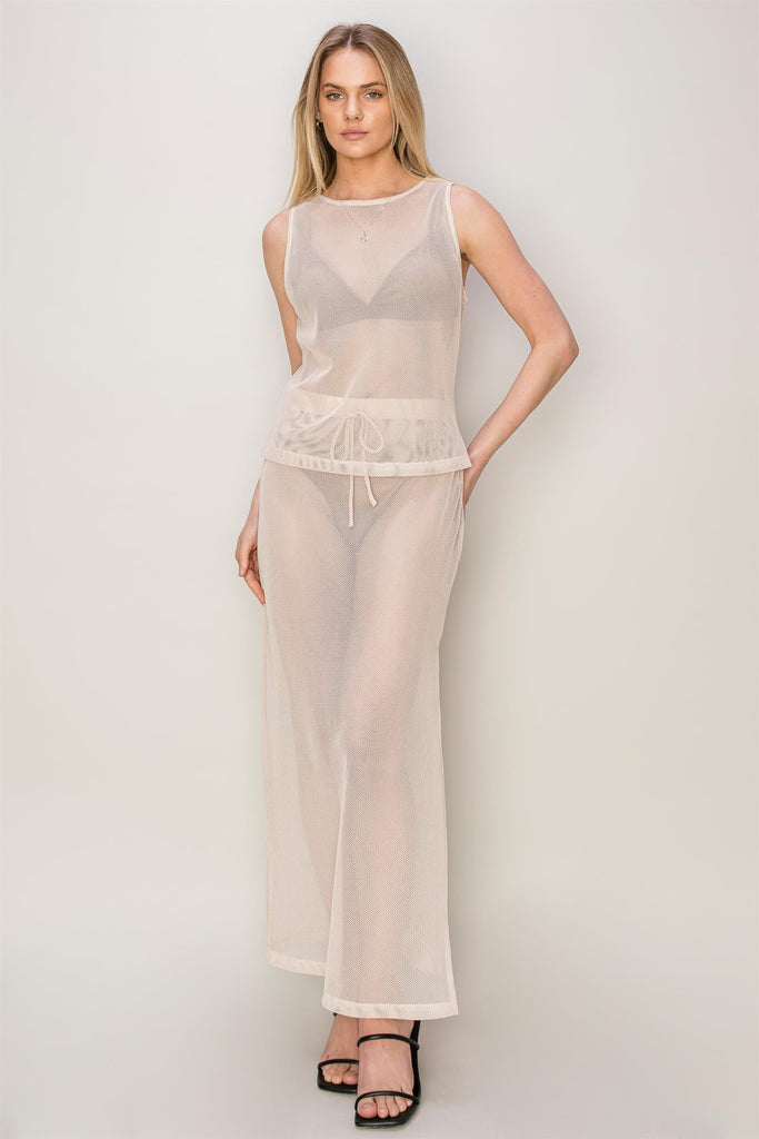 Be the centre of attention wherever you go in this metallic knit two-piece set. It has a sleeveless top with a round neck and flattering fit, teamed with a matching h-line high-waisted maxi skirt that is secured by a drawstring closure.