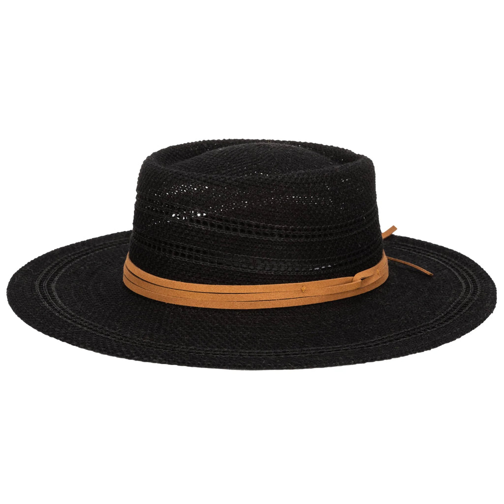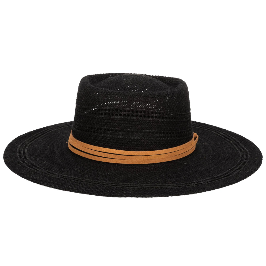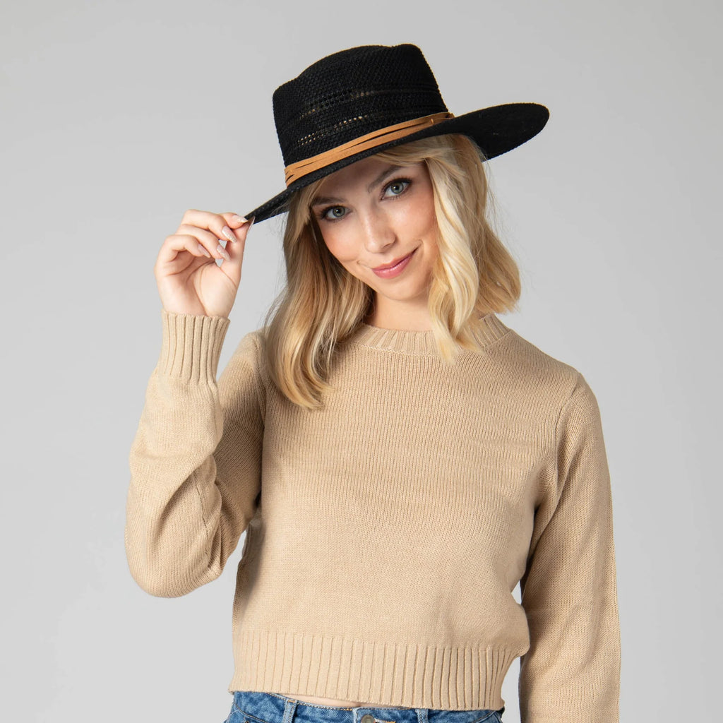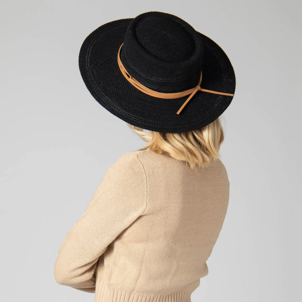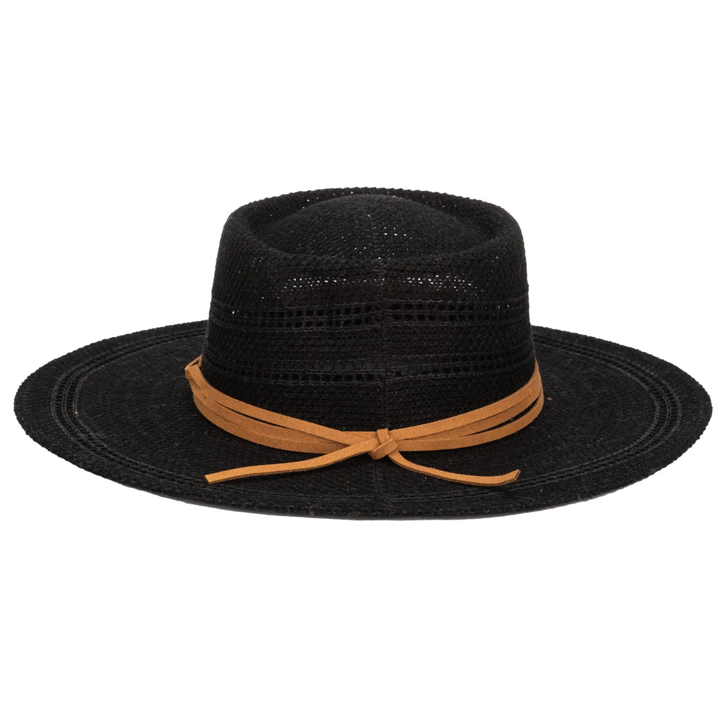 Embrace the fall vibe every time you step out in the Jackson Knit Boater. A perfect transitional telescope boater to add to your collection. A chic open weave, wide brim, flat crown and faux suede triple layered band with back knot details.