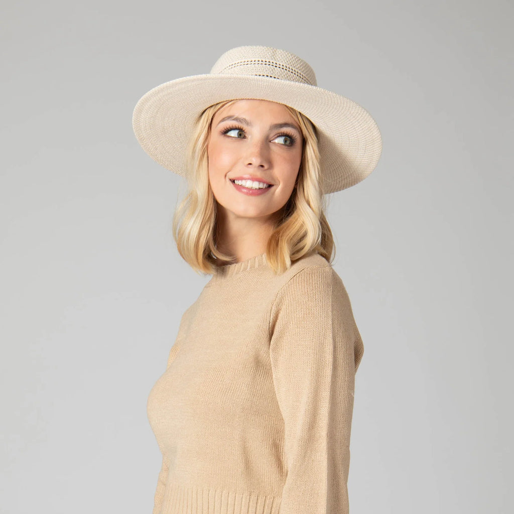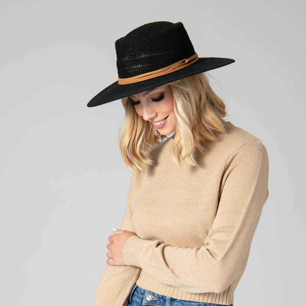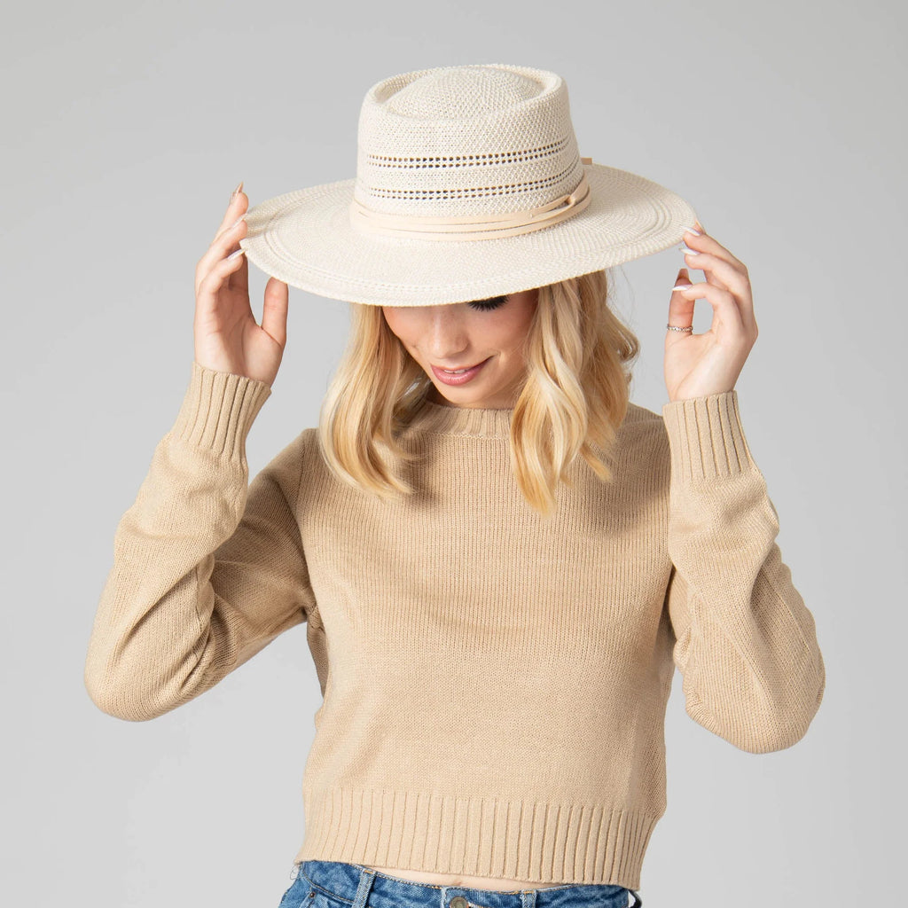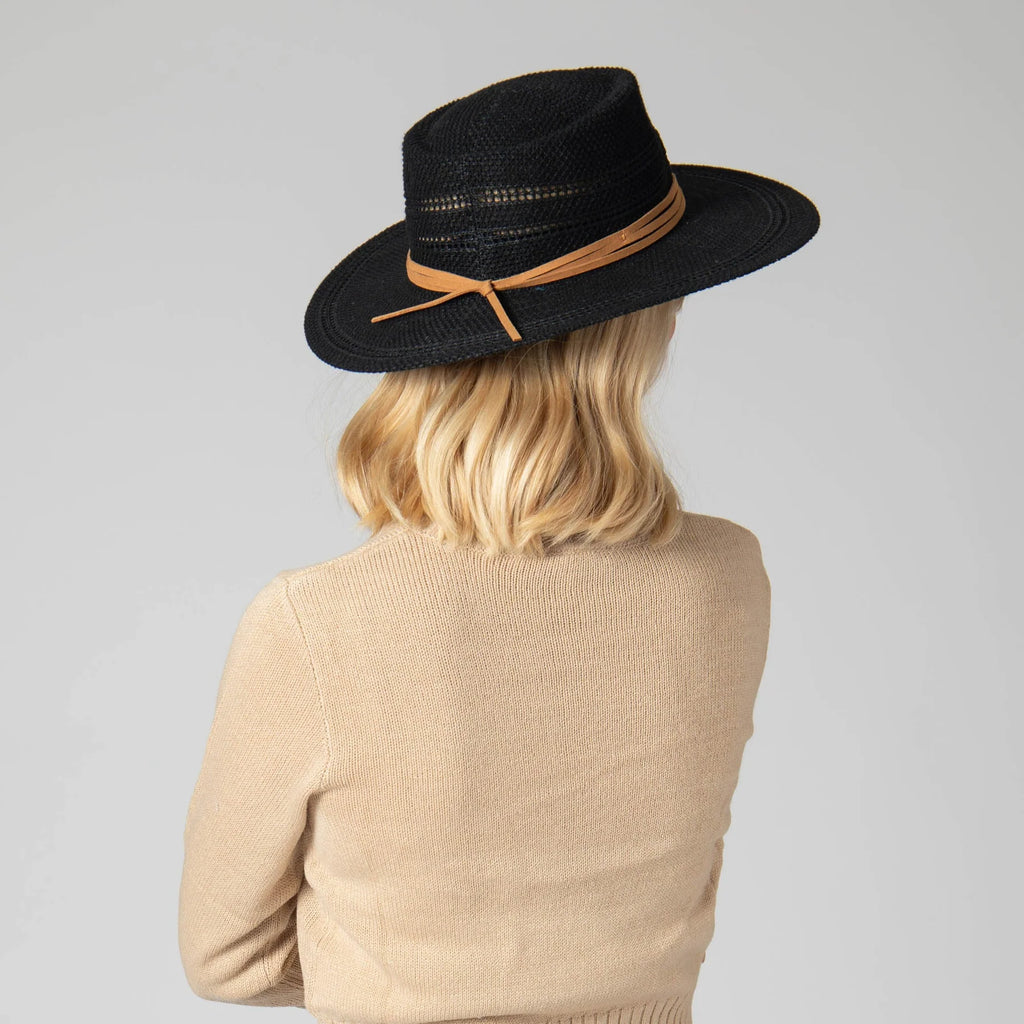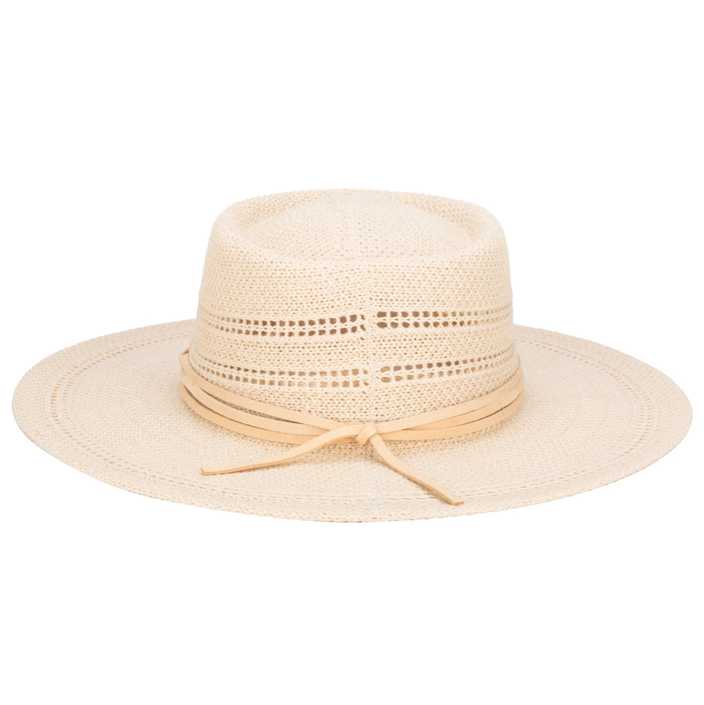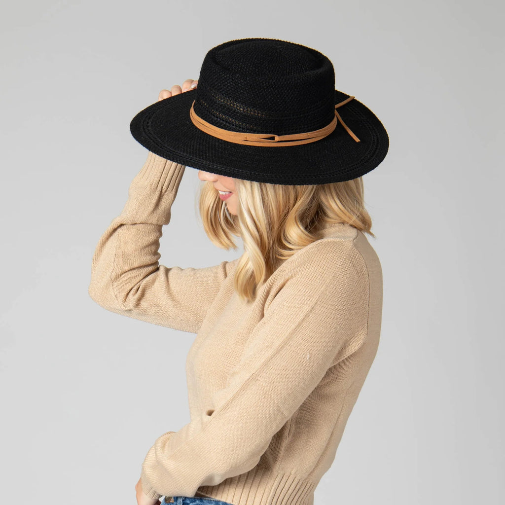 Embrace the fall vibe every time you step out in the Jackson Knit Boater. A perfect transitional telescope boater to add to your collection. A chic open weave, wide brim, flat crown and faux suede triple layered band with back knot details.