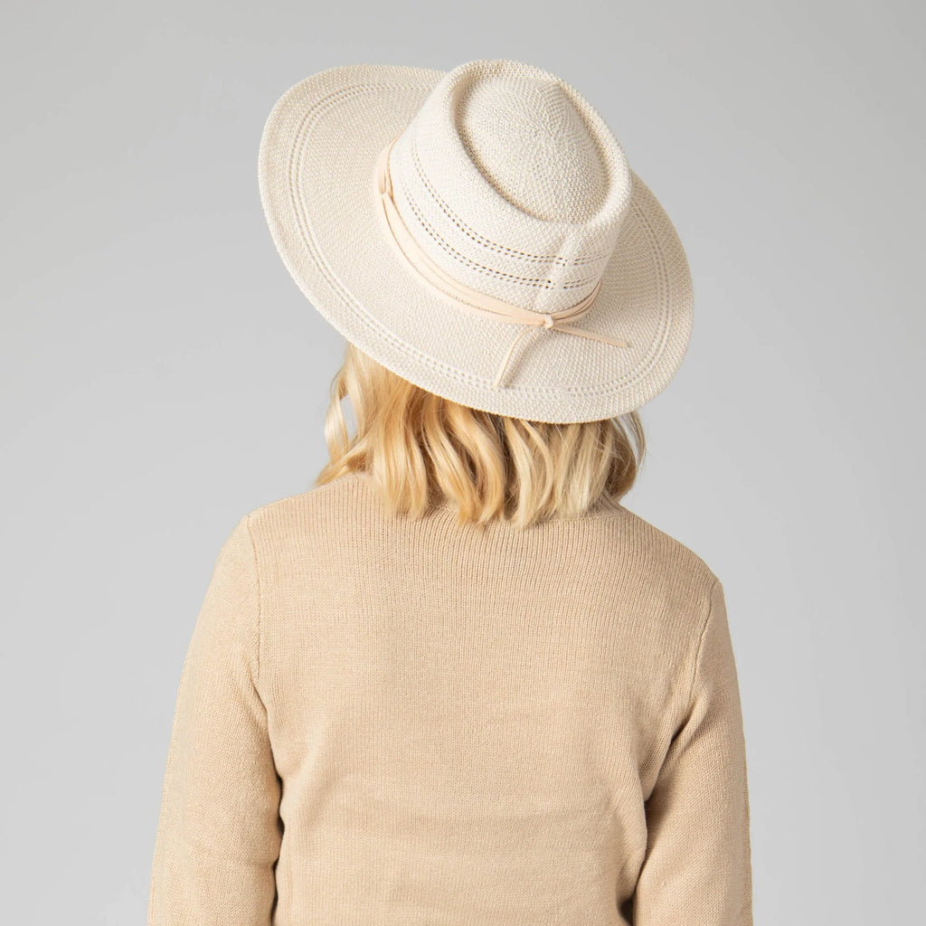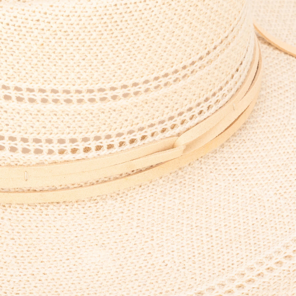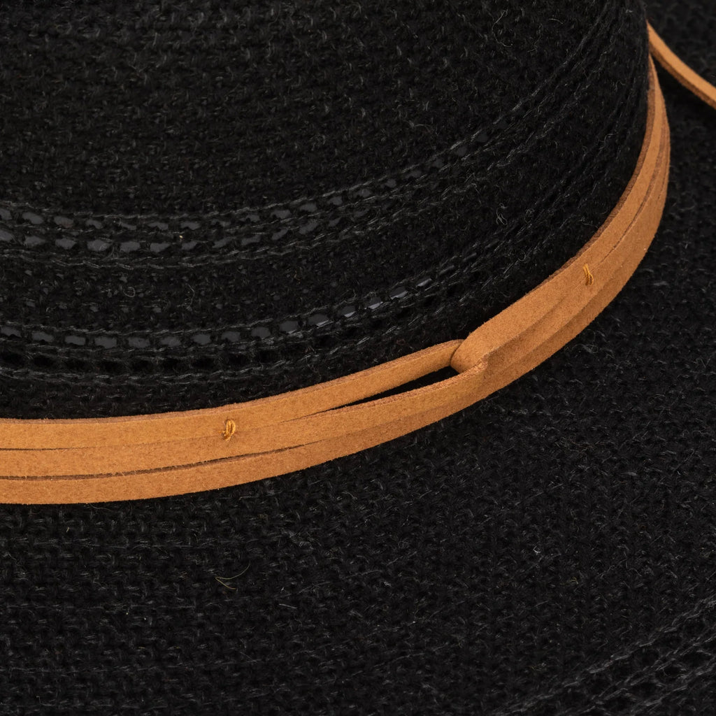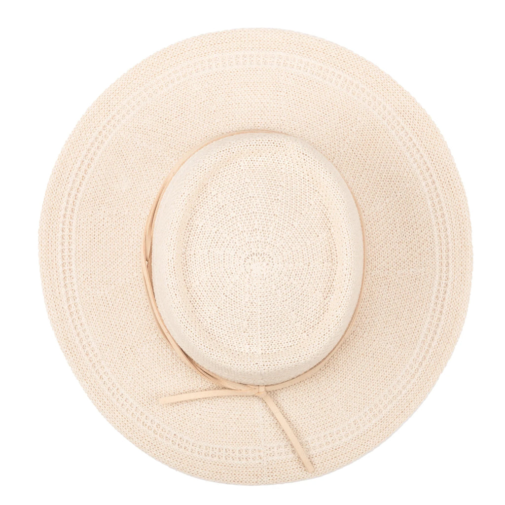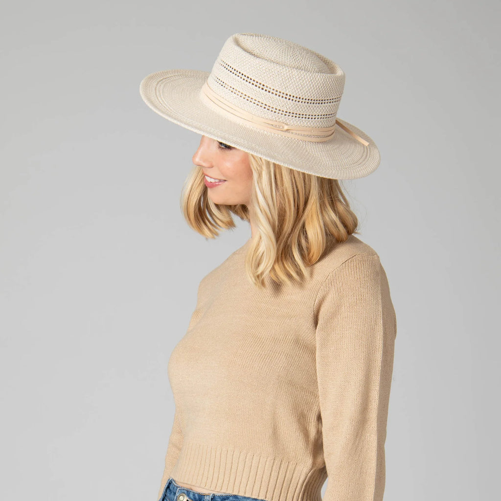Embrace the fall vibe every time you step out in the Jackson Knit Boater. A perfect transitional telescope boater to add to your collection. A chic open weave, wide brim, flat crown and faux suede triple layered band with back knot details.