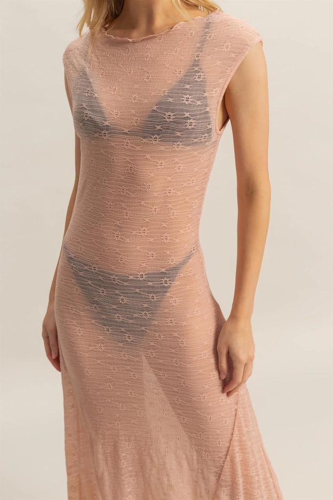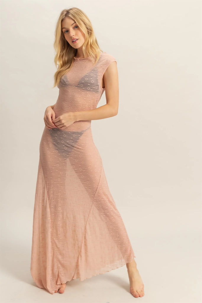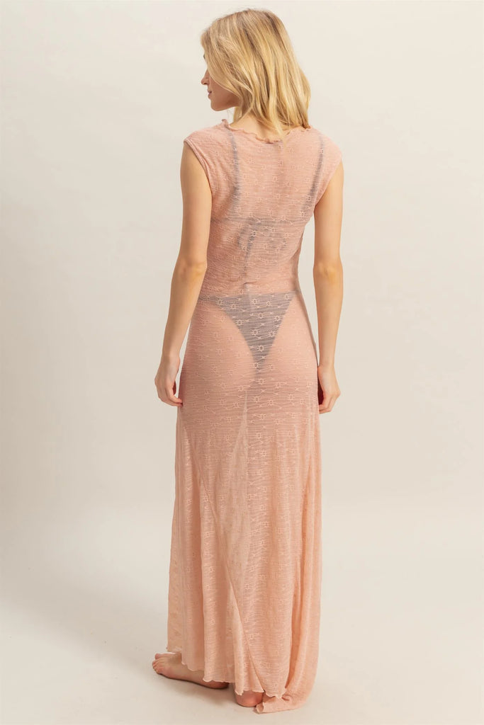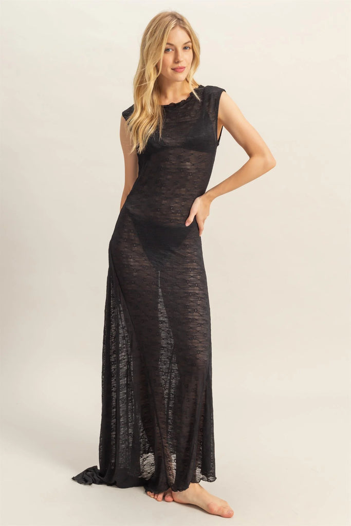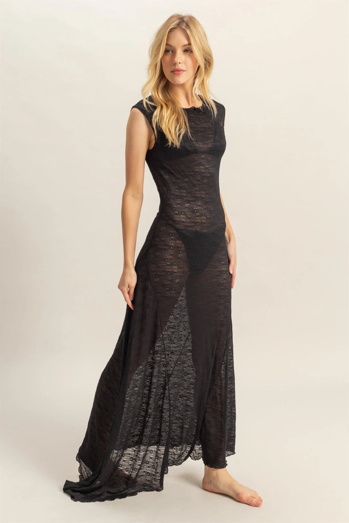 Timeless And Sweet, This Dress Is A Must-Have. A Crew Neckline Falls Into A Sleeveless Cut Bodice That Offers A Snug Fit. The Coverup Dress Falls To A Maxi Hem And Ends In An Asymmetrical Hemline. Lace Detailing Completes The Look.
