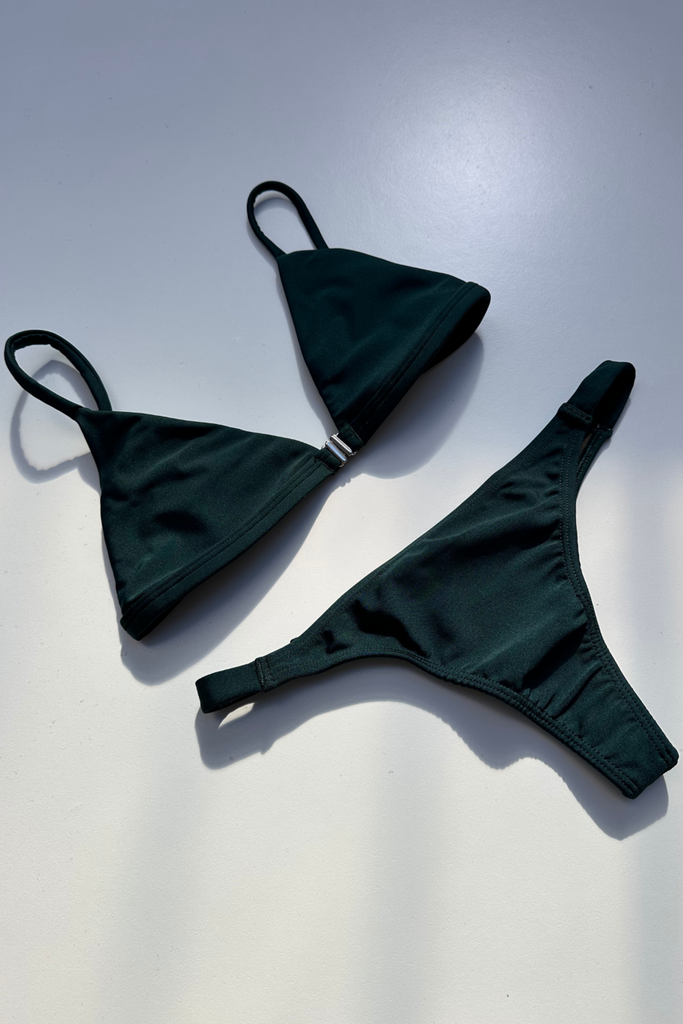 Fixed triangle top with front clasp. Adjustable straps and space to insert cups.