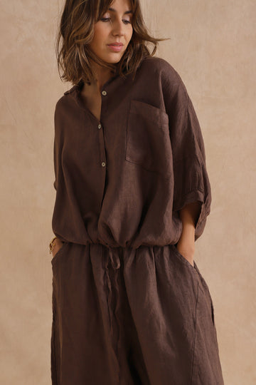 A relaxed-fitting, wide-sleeved shirt moves naturally over the body. The button-front closure and adjustable drawstring waist allow for silhouette play, while the front pocket and back pleat add subtle design details. A versatile and lightweight piece designed to combine comfort and elegance with a contemporary touch.