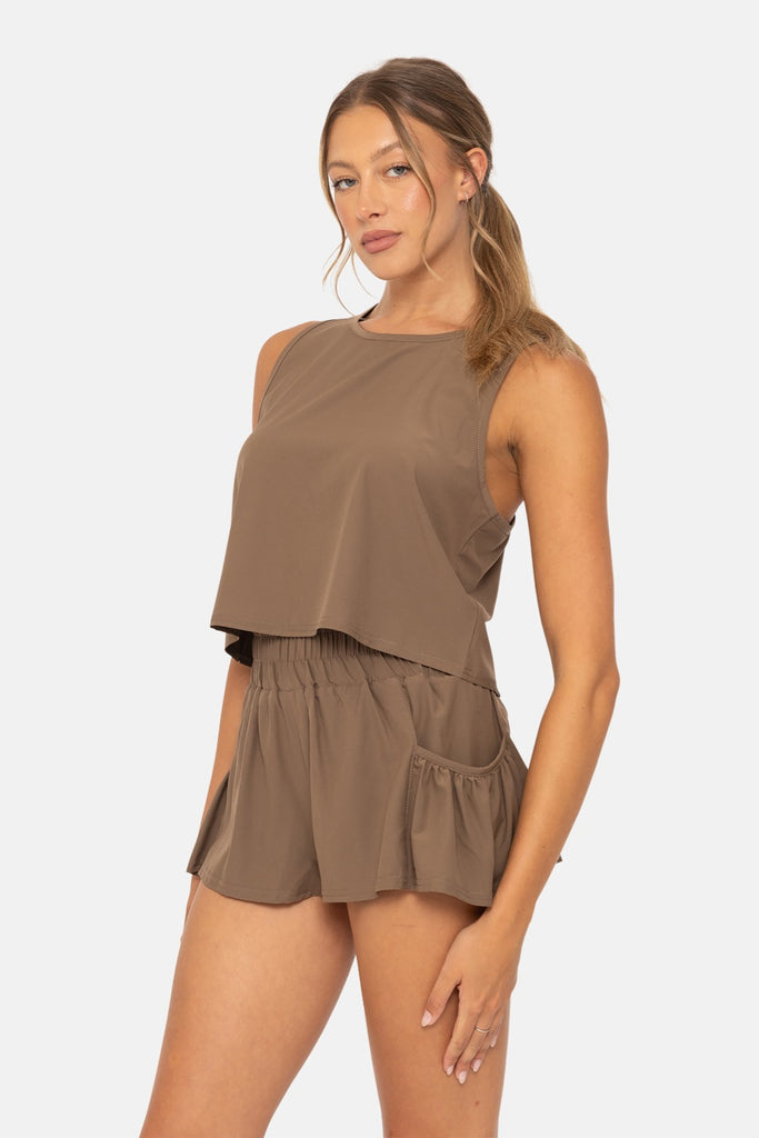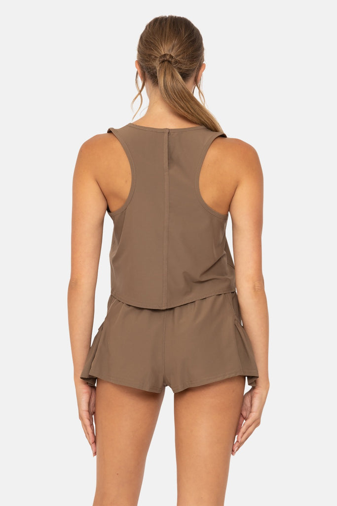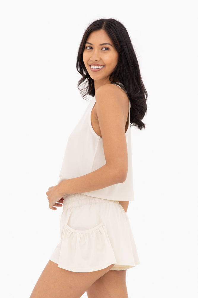 Trendy loose cropped tank top featuring a snap closure keyhole for a touch of edgy flair. Effortlessly chic and versatile.