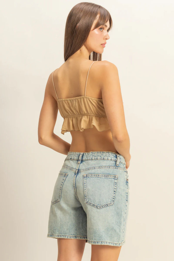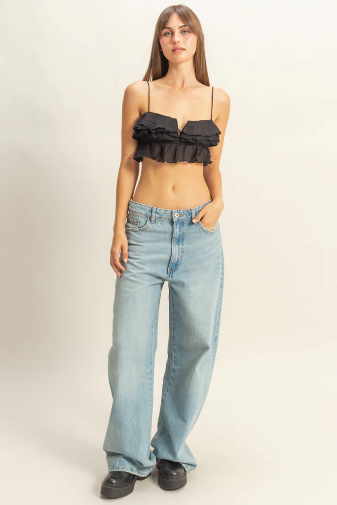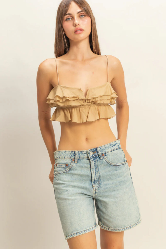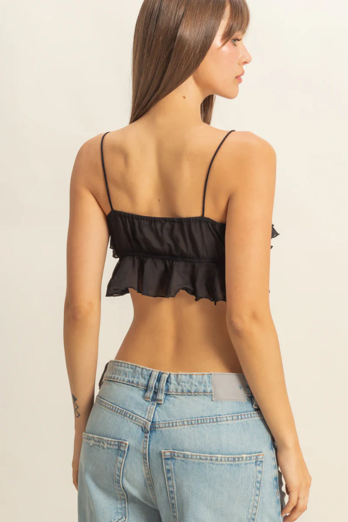 Cami Crop Top Featuring A Notched Neckline With Thin Shoulder Straps. Designed With A Tiered, Layered Ruffle Bodice And A Cropped Silhouette. Constructed From Lightweight Fabric, Suitable For Casual Or Semi-Dressy Styling.
