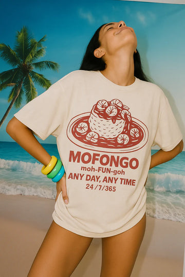 The T-shirt features the text 'MOFONGO moh-FUN-goh ANY DAY, ANY TIME 24/7/365', with a slight variation in the second image as '24/7/366'. It is in English and promotes the versatility and appeal of the dish Mofongo. The design includes a graphic of a Mofongo dish, presented in a traditional illustration style with a red color scheme. This highlights a cultural staple, celebrating Puerto Rican cuisine and identity.