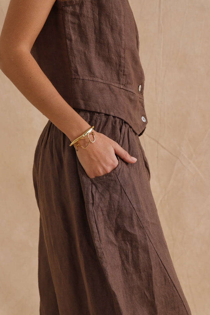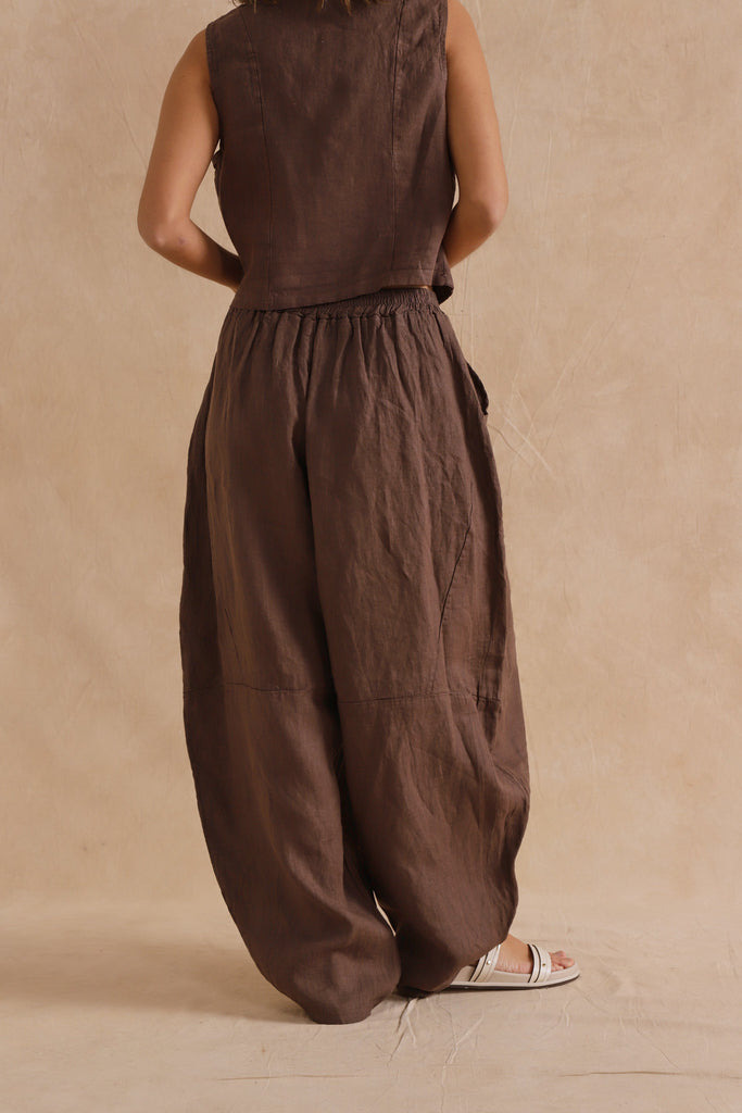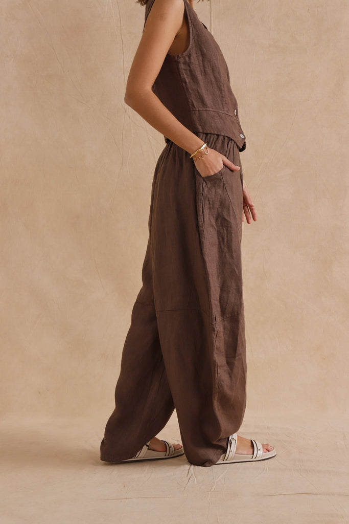 100% linen slippers with a relaxed fit that flows effortlessly with every movement. The elastic waistband provides effortless comfort, while side pockets and cutouts add subtle design details. A fresh and versatile piece, designed for light and stylish movement on warm days.