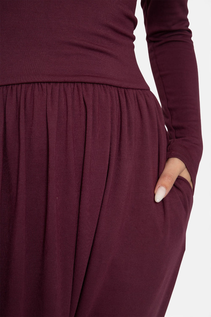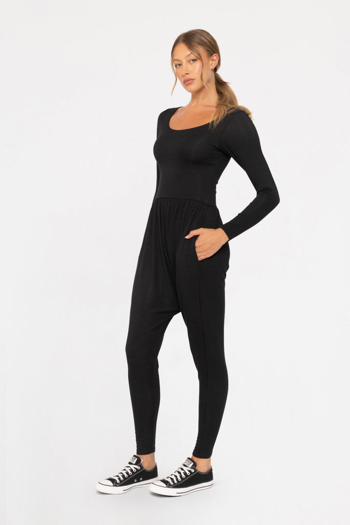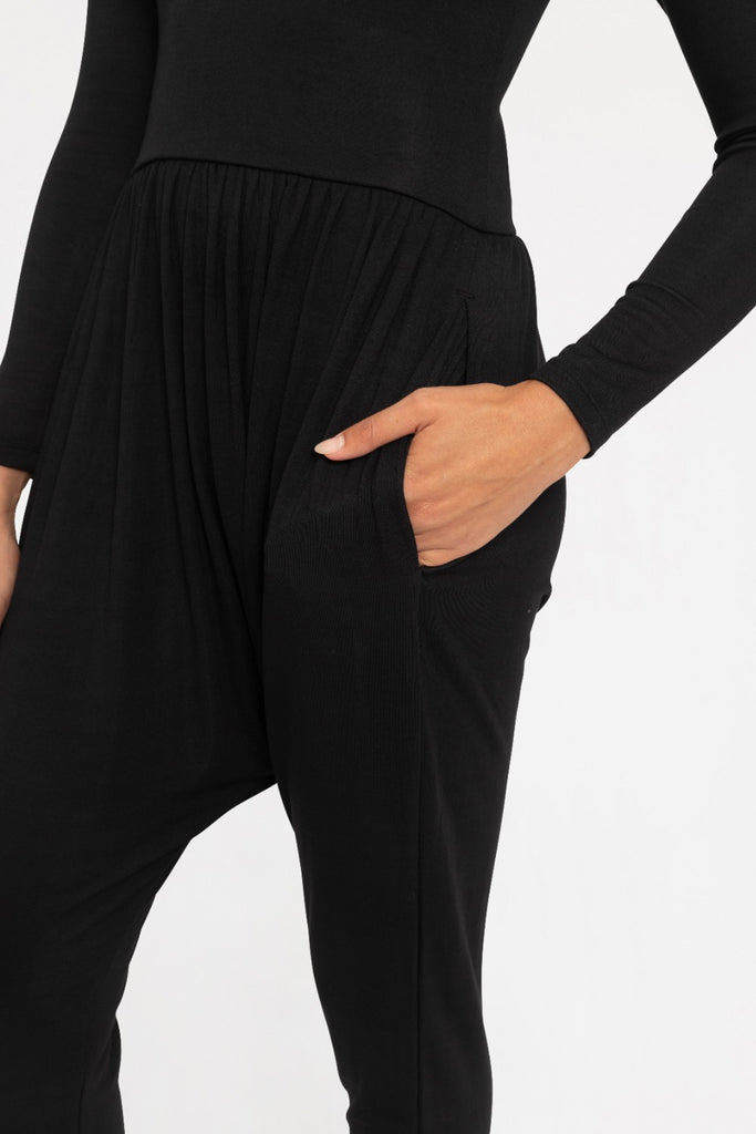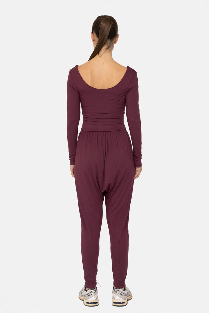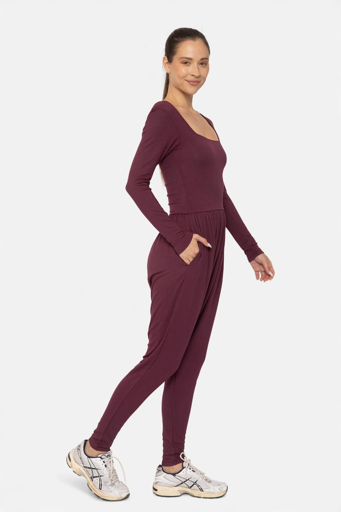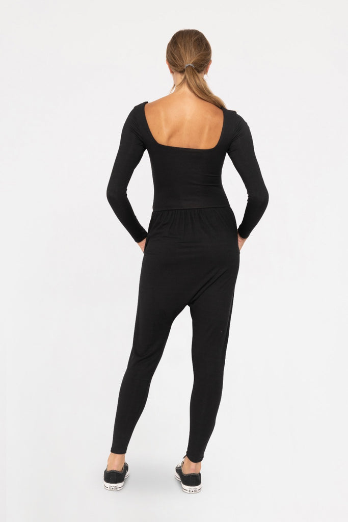 Reversible jumpsuit featuring a square neckline on one side and a flattering scoop neckline on the other. Fitted top with long sleeves, an elastic waist with shirring for a slimming effect, and a stylish drop crotch with tapered legs.