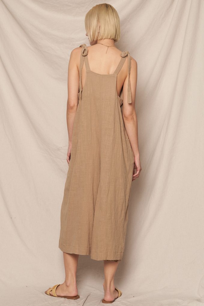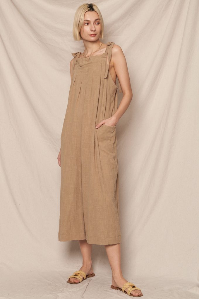 Ruched Neck Shoulder Tie Loose Fit Jumpsuit with Pockets