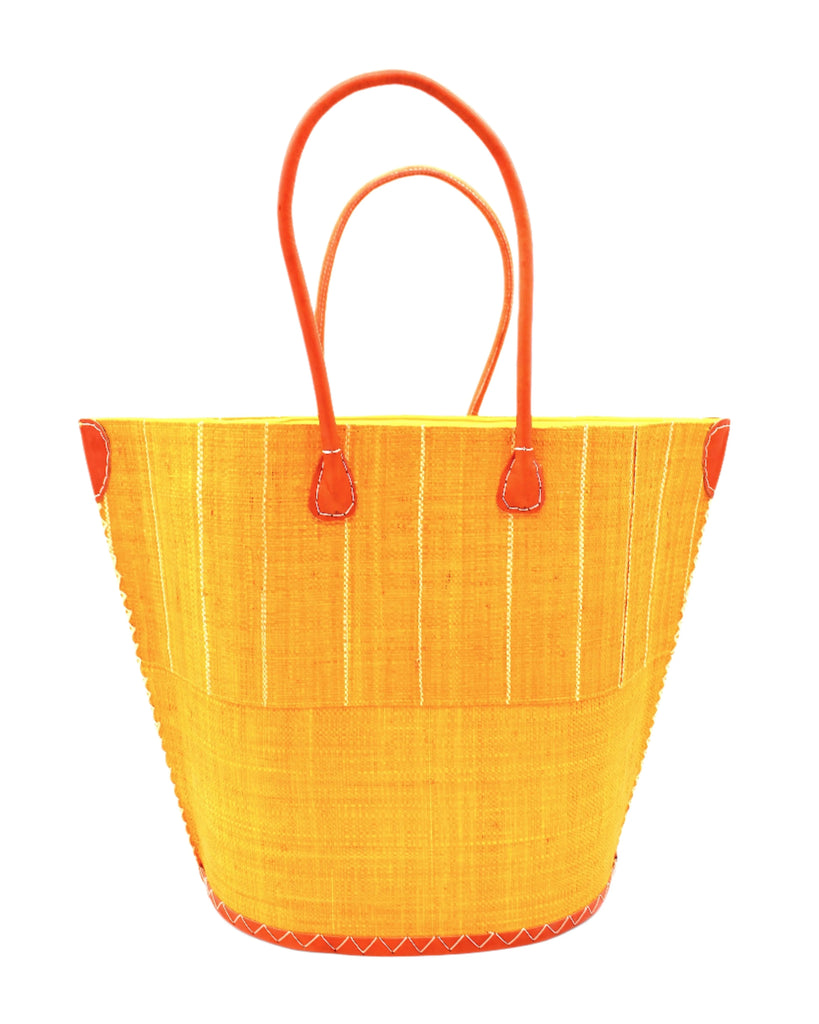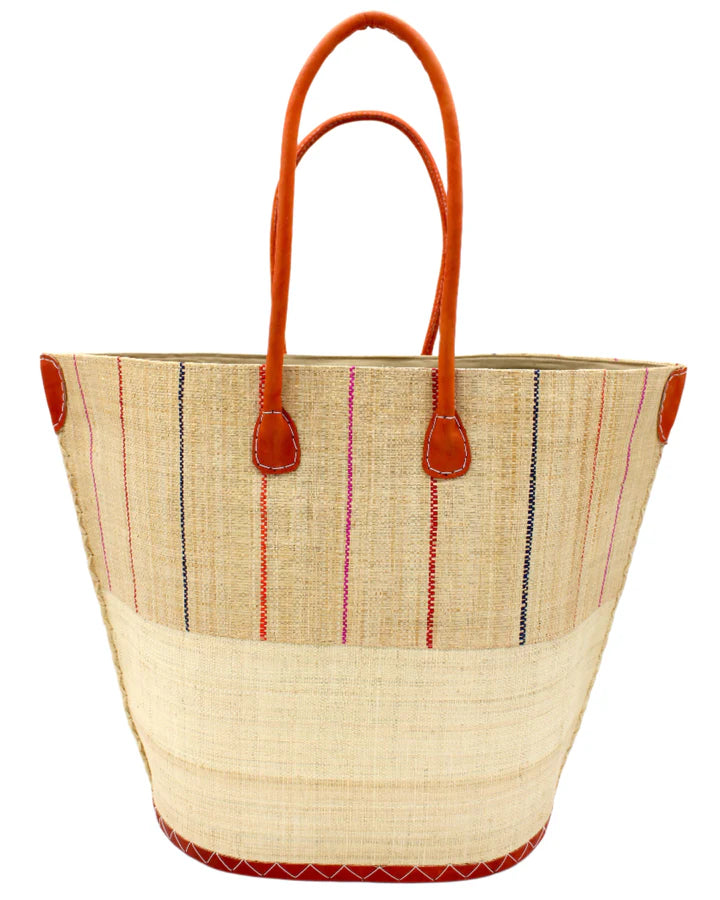 This elegant Santa Cruz Two-Tone Pinstripes Large Straw Bag is handmade from loomed raffia, with special attention to detail given to the leather handles, corners, and base binding. An internal pocket and drawstring closure provide security and convenience, while the roomy size offers ample storage. For convenience and lasting beauty, the bag can be easily brushed off with minimal effort.