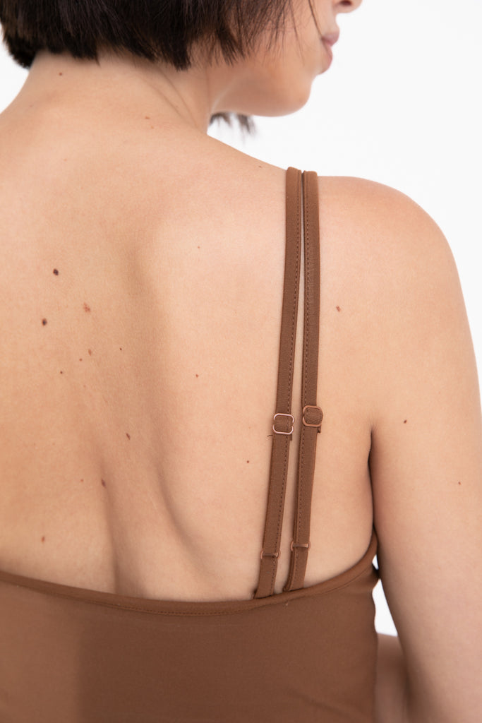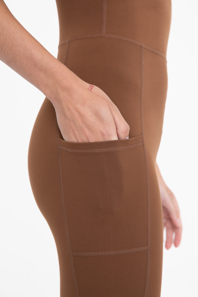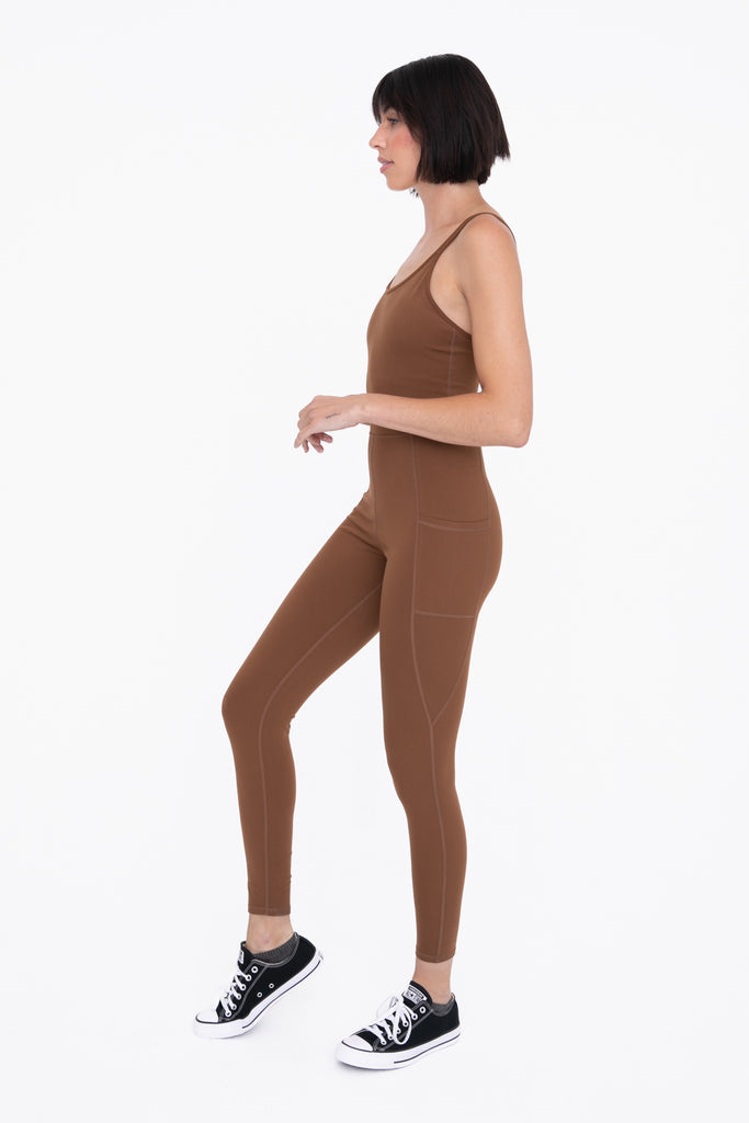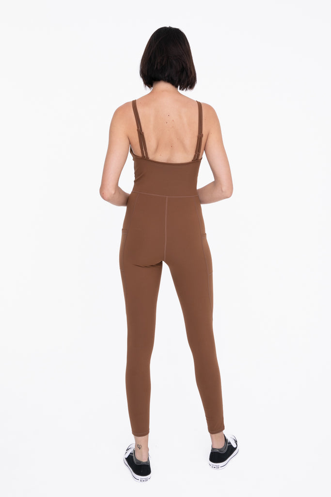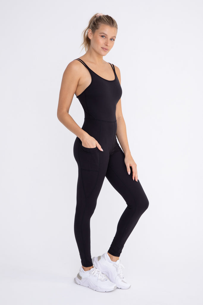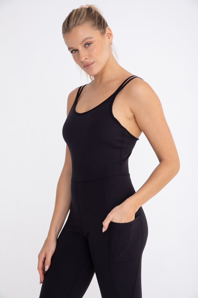 This sleeveless catsuit features a high front neckline and low back for breathability. It has double adjustable straps for extra support, a full built in bra, inseam legging pockets, and smooth flatlock seaming. Wear it to your next workout or throw a jacket over for when you go out.