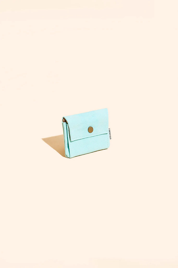 Cardholder made from leftover scraps of 100% cotton canvas from backpack manufacturing, metal clasp, and 100% cotton interior. It has two compartments to carry up to 15 cards, folded bills, and/or coins.