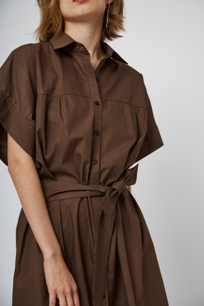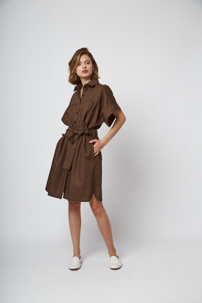 Vestido corto camisero de poplín con lazo ajustable en cintura, zócalo en manga y bolsillos laterales.