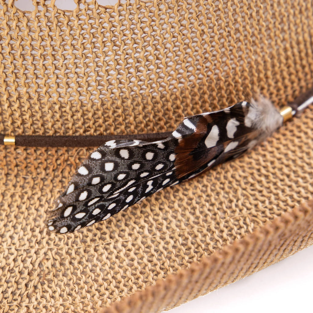The Gabriela Cowboy hat is the perfect accessory for any outfit. It features a machine knit pinch crown with dainty faux suede cording, gold cord clamps, and a tonal feather detail. Available in Toast or Natural, with a brim size of 3.25" ensures a comfortable fit for all head sizes (57cm). Embrace your inner cowgirl with this stylish and versatile hat.